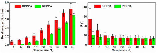 The relative execution time (the execution time of each calculation processed against the longest computation among all of the sample size results), and the evaluation metric for the estimation with different methods and different subjects, are depicted in Figure 7. As the sample size increases, so does the execution time. Compared to the increase in time using BPPCA, RFPCA appears more efficient for the training, as it is less time consuming. Although the value of R decreases and the error decreases with the larger sample size from 1 to 10 GDs, both of the methods have no significant changes after Ss = 20. When Ss ≥ 30, the R of BPPCA is slightly smaller than RFPCA, with a longer execution time.