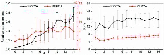 In the process of training, different previous sEMG signals were used, and the result of relative execution time and the evaluation metric are shown in Figure 8. As the attributes of input Xt increase, the execution time of the different methods also increases, and this is more pronounced for BPPCA. RFPCA is much smaller, which is conducive to the application of myoelectric control. For the results of R, the estimation errors of different methods are various. The BPPCA results are much larger than RFPCA, and the method is insensitive to the input dimension when n is larger than approximately 7. The results of RFPCA seem to increase when n is bigger than 2. The results of R also show that BPPCA has larger standard deviations than RFPCA.