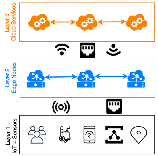 Edge Computing (EC) [31] represents a paradigm aimed at solving some challenges found in the management of these heterogeneous sources, as well as the acquisition, processing, and transfer of data among massive, interconnected devices [32]. Thanks to the application of Edge Computing techniques, it is possible to prevent an overload of computer processes, as well as, obstructions in the flow of data and the services that are sent or requested to the cloud. This is done by executing computing tasks closer to the IoT devices, that is, directly in the network Edge [33]. Thus, the first phase consists in the management, storage, data analysis, as well as decision making, and it is carried out in multiple Edge Nodes of the IoT network instead of being managed centrally in the Cloud [33,34], improving the response time, security and QoS (Quality of Service) of the services executed in the edge [31]. A basic scheme of an Edge Computing architecture consists of three layers, as follows [6,33] (see Figure 1):