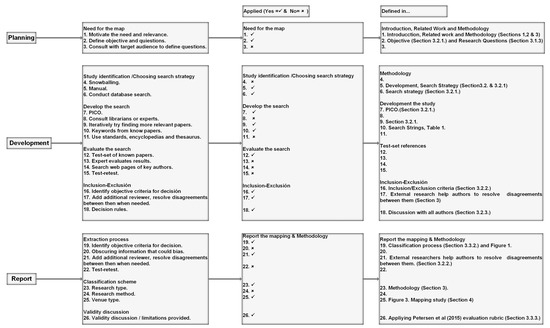 Petersen et al. [39] established a rubric to validate and evaluate Systematic Mapping Studies. The evaluation rubric is formed by 26 activities that should be performed when conducting an SMS. According to the authors, a well-developed SMS performs at least 33% of these activities. This means that a minimum of 9 activities must be performed to obtain a mid-quality SMS. As established in Petersen’s Guidelines, to measure the validity of an SMS, it is necessary to calculate the ratio between the number of activities performed in an SMS and the 26 activities proposed in the guidelines. Figure 2 shows the three phases in which this mapping was divided: Planning, Development, and Report, as well as a list of activities that have been performed to ensure the validity of our study, all of them based on the Petersen et al. [39] evaluation rubric. Likewise, the SMS has been developed by applying 16 of the 26 activities established by the Petersen rubric. The ratio obtained is 61%. Therefore, the SMS is above the established median quality according to Montalvillo and Díaz [57].
