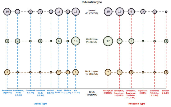 Once the filtering process has been completed, the obtained articles were classified on a spreadsheet into the following categories: Author, Title, Year, Type of Publication, Research Type, Evolution Activity and Asset Type. The Type of Publication is divided into Journal, Conference Papers and Book Chapters. In the Research Type category, studies are classified into: Conceptual, Experimental, Validation. The evolution activity allows one to classify the articles determining if only analysis is carried out or if the proposed solution is implemented. The Asset Type consists of the main contribution of the article: an architecture, method, model, framework, or platform. There is a set of articles that can contain two or more research types or asset types. In those cases, a single record containing the categories is made to avoid duplicity in the data. The results of the development of this process are detailed in Table A1.