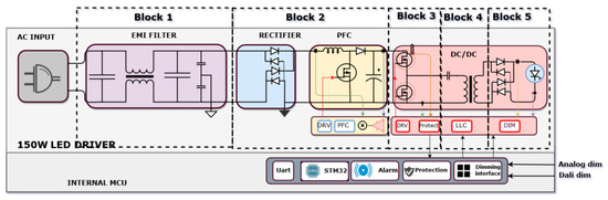 The presented converter for the high-power LED is based on two power stages, namely, a boost PFC AC/DC converter and an LLC resonant converter, depicted in Figure 1. The function of the LED driver is to provide a constant current to the LED load. As illustrated in Figure 1, the system consists of an EMI filter, a PFC circuit for improving the input PF, and a half-bridge DC/DC converter for building output voltage. There are five blocks in this LED driver topology.
