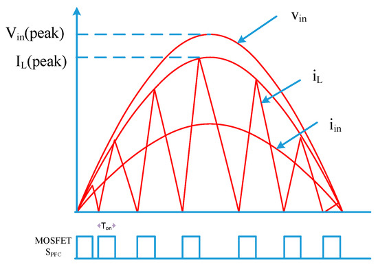 Figure 3 shows the key waveforms of the boost PFC converter in the case of the CrCM. To obtain a unity power factor, the AC input voltage (vin) is measured to provide a reference for inductor current. In the CrCM mode, the inductor current ripple (IL(peak)) is twice the sinusoidal input current (iin), and the switching frequency of the power switch is variable with constant on-time (TON), as shown in Figure 3.
