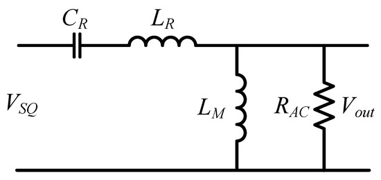 Figure 5 shows the equivalent circuit of the LLC half-bridge converter based on the first-harmonic approximation (FHA) method, where RAC is the equivalent load resistance. There are two resonant frequencies (fr1, fr2), as shown in Equations (1) and (2), for the LLC half-bridge converter [24]: