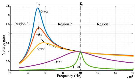The behavior of voltage gain as a function of m and Q in Equation (4) can be plotted, as shown in Figure 6. The two resonant frequencies, as shown in Equations (1) and (2), divide the frequency range into three regions: Region 1 is the zero voltage switching (ZVS) region in the right half-plane of fr1; Region 2 is the ZVS region between fr1 and fr2; and (3) Region 3 is the zero current switching (ZCS) in in the left half-plane of fr2.