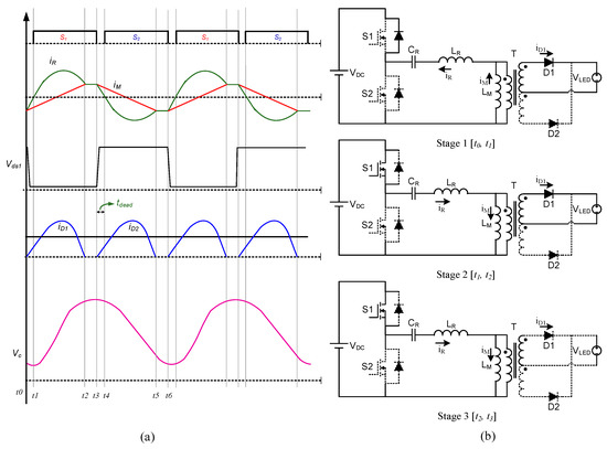 The waveforms and equivalent circuits of the LLC resonant converter working in region 2 are presented in Figure 7a,b, and the operation principle is described as follows: