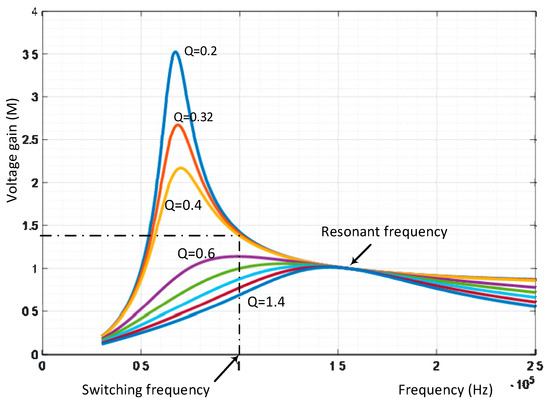 Figure 8 shows the voltage gain characteristics of the LLC converter according to the different quality factor Q in the case of m = 6 and resonant frequency fr = 159 kHz. It can be seen that, with the switching frequency of 100 kHz and the quality factor Q = 0.32, the voltage gain is 1.4. From Equation (10), the output voltage of the power converter is verified as Equation (17).