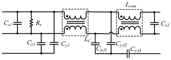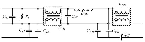 For the differential-mode component, there is a freedom in choosing the differential mode inductor LDM and X-capacitor capacitance. Hence, LDM and Cx1, Cx2 are decided according to Equation (22).