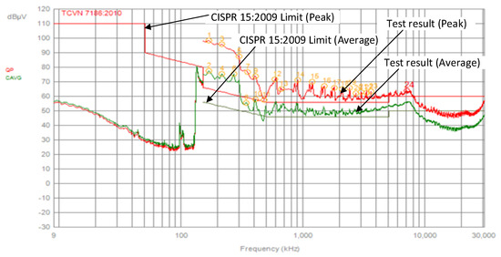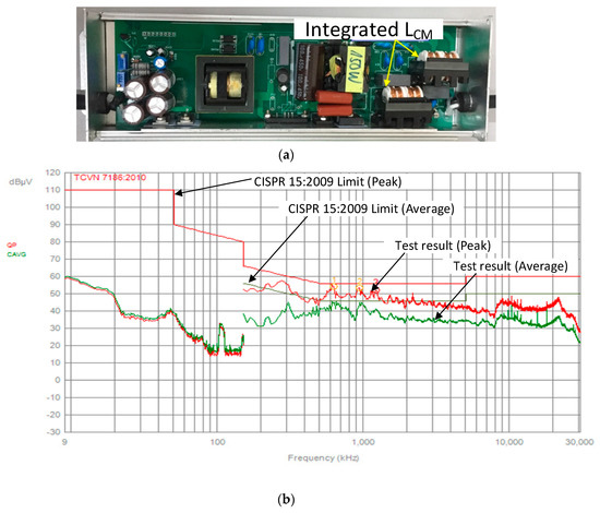 Figure 16a,b show the prototype and the conducted EMI test results with the peak and average in the case of using LCM and LDM as two separated inductors LCM and LDM. Similarly, Figure 17a,b show the prototype and the conducted EMI test results with the peak and average value, in the case of using LCM and LDM in combination. It proves that the prototype can pass the CISPR 15:2009 standard.