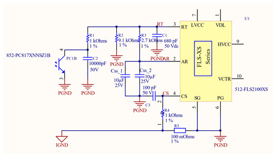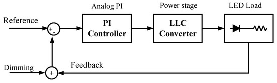 The LED dimming is implemented as shown in Figure 13, which is described as the error between the reference value and feedback value, and is the input of the analog proportional–integral (PI) controller. In addition, the output of the PI controller is used to feed the opto-coupler, which is connected to the RT pin of IC FLS2100XS to adjust the switching frequency.