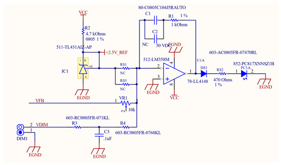 The schematic circuit diagram of the analog PI controller is presented in Figure 14. The analog PI controller is implemented by using op-amp LM358. First, the load current is measured by using the shunt resistor and feedback to the analog PI controller circuit through the variable resistor VR1. Second, the reference voltage is generated by using IC TL431, and it is set at 2.5 V. Hence, the 0–10 V or PWM dimmer is connected to R1 and the LC filter (R1, C1) generating the DC voltage. The feedback current and the dimming current signals are added and compared to the reference current signal. In addition, the error signal is fed into the analog PI controller, as shown in Figure 13.