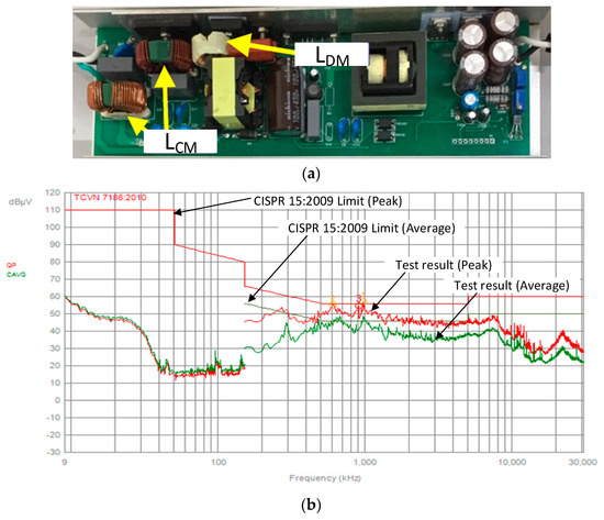 (a) The 150 W-based two-stage LED driver using EMI filter with discrete LCM and LDM. (b) EMI frequency spectrum.