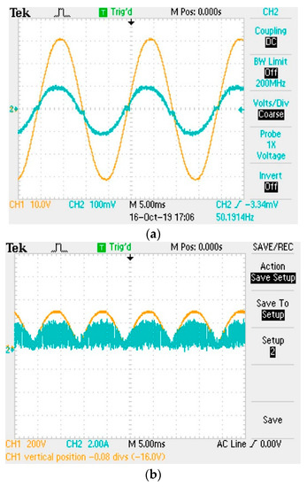 (a) Experimental results of input voltage/current, and (b) experimental results of full-bridge rectifier voltage and inductor current of boost PFC.