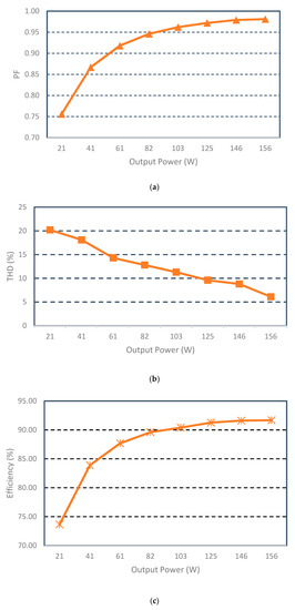 Experimental results of (a) PF and (b) total harmonics distortion (THD). (c) Efficiency with changing power load.