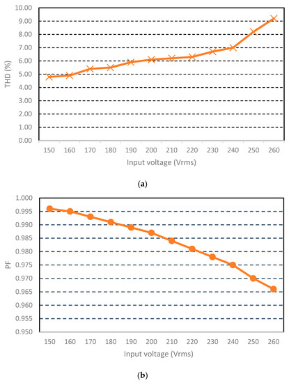 Figure 23a,b show the curves of the system PF and THD with changing input voltage. As shown in these figures, when the input voltage changes between 150 and 220 Vrms, the system THD is always lower than 10%, and the PF remains greater than 0.965. From Figure 22 and Figure 23, the system THD always satisfies the IEC 61000-3-2 standard.