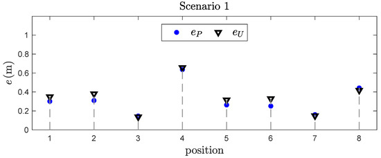 The lower value of was m, and the higher value was m, which ensured a high level of localization accuracy. Table 11 also shows that the lower value of the standard deviation was m, and the higher value was m. Such values of and guaranteed accurate position estimates that were compatible with the envisaged applications, as discussed in Section 1. As expected, the values of and were similar to the corresponding values of and , which ensured that the position estimates were not distributed along special directions.