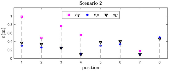 The lower value of was m, and the higher value was m, which ensured an accuracy of localization compatible with the intended applications discussed in Section 1. Moreover, the lower value of the standard deviation was m, and the higher value was m. Such values of and guaranteed accurate position estimates. The values of and were similar to the corresponding values of and , which ensured that the position estimates were spread all around the true position of the TN and that the position estimates are were distributed along special directions.