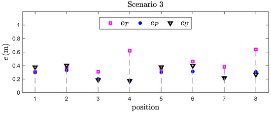 Figure 4 shows a summary of the experimental results for the third scenario. Note that the values obtained with the three localization algorithms were all similar in this scenario. Therefore, in the idealized case of an empty environment, the three considered algorithms achieved similar levels of accuracy, which were all sufficient to support the envisaged applications of indoor localization.