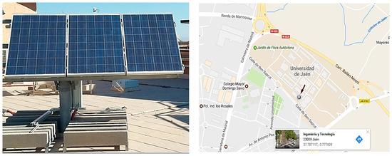 The monitored system is a commercial photovoltaic self-consumption system which has been installed in the Higher Polytechnic School of Jaén (latitude: 37°47′00″ N and longitude 3°47′0″ W) at the University of Jaén. It consists of an array power of 555 Wp STC (Standard Test Conditions) (Figure 1), and an inverter model Soladin-600, with 535 W of nominal power. It must be noted that STC implies a normal irradiance (Gi) of 1000 W/m2 and a cell temperature (TC) of 25 °C. The array power consists of three commercial photovoltaic modules, Deikko DKP-185, connected in series tilted 50° to the horizontal, facing south. Additional information about the main characteristics of the PV generator can be found in Table 1.