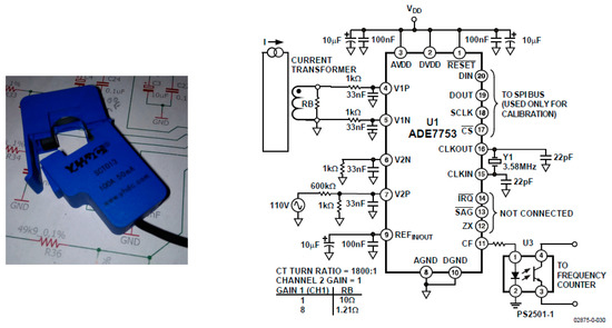 To measure the AC electrical parameters at the inverter output (current, voltage, frequency, active, reactive and apparent power and energy), the integrated circuit Analog Device ADE7753 is used together with the sensor SCT-013 [45], which is connected to one of the ADE7753 inputs. In Figure 5, the sensor SCT-013 is shown, together with the block diagram showing the connection to the integrated circuit. The ADE7753 circuit is an energy monitor. It is a mixed processor (digital/analog) which provides information about the power used (active, reactive and apparent), using output pulses of variable frequency or following the standard serial protocol. It has two inputs: one is proportional to the load voltage, and the other one is proportional to the current that circulates through the load. Its operation consists of digitalizing the signals which are related to the load voltage and current and multiplying them so that the result is proportional to the load power [46,47].