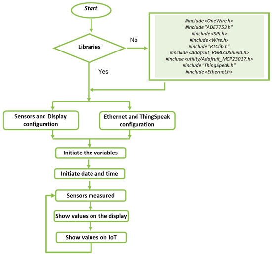The main objective of the prototype is to monitor in real-time the performance of a photovoltaic self-consumption system. To achieve this goal, the proposed methodology is summarized in the flowchart shown in Figure 7.