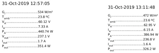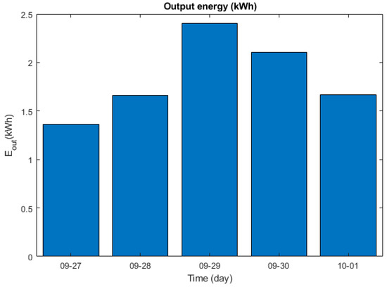 In Figure 11, a column chart is shown with the energy generated (Eout) daily, on a September day. To evaluate the operation of the inverter, the relationship between the powers, PA and Pout is calculated, with which an average efficiency value of the inverter is obtained. Values are obtained from those of 90%.
