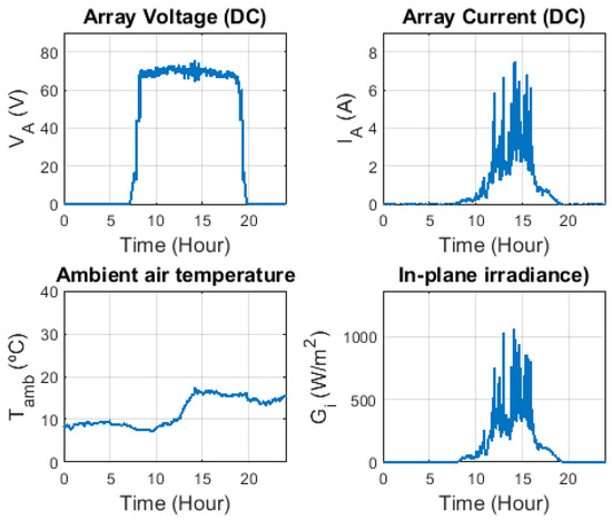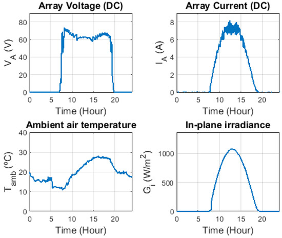 In addition to the above graphs, it is possible to download all the data acquired by the DAS. This data can be downloaded in the “.csv” format. Figure 12 shows daily monitored data (Gi, Tamb, VA and IA) for a cloudy and sunny day.