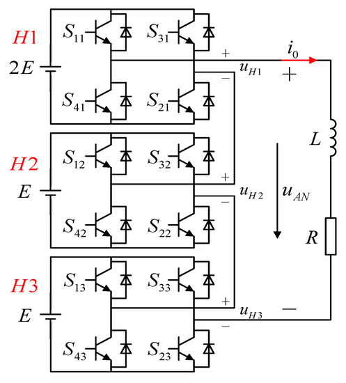 Asymmetric nine-level inverter topology is shown in Figure 1 which is cascaded from three H-bridge units. The DC side voltages of the three H-bridge units H1, H2, and H3 are 2E, E, and E, respectively. The output voltages of the three units are defined as uH1, uH2, and uH3, the output phase voltage is uAN, the fundamental amplitude of the output phase voltage is uAN(1), and the output phase current is io.