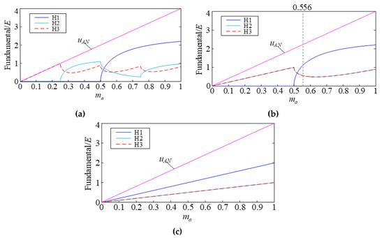 Figure 3a illustrates the relationship between the fundamental wave of the output voltage of each unit and the modulation depth obtained by the traditional modulation strategy in [18]. The fundamental amplitude of the three elements cannot be linearly related to the modulation depth. According to the analysis of Equation (7), it can be seen that this modulation strategy cannot achieve power balancing. Figure 3b shows the relationship between the amplitude of the fundamental voltage of the output voltage and the modulation depth of the three units at full modulation. It can be seen that uH1(1) : uH2(1) : uH3(1) = 2:1:1 is only available when the modulation depth is ma = 0.556, which achieves output power balance between three units, under the other modulation depths, the amplitude of the fundamental voltage of the three units cannot satisfy this relationship.