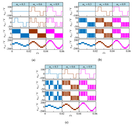 Figure 4b shows the waveforms of the output voltage and output phase voltage of each unit in the MHF-PWM modulation strategy at three modulation depths of ma = 0.3, 0.6, and 0.9. It can be seen that the high voltage unit does not participate in the voltage output at low modulation, the output voltage waveforms of the two low-voltage units are the same under each modulation depth. Symmetrical output phase voltage can be obtained by superimposing the three cell output voltages.