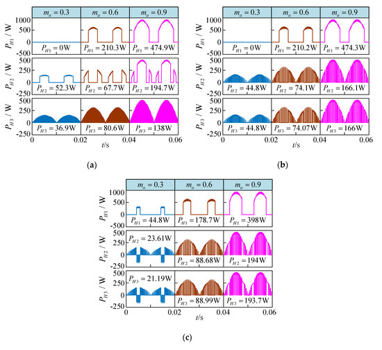 Figure 5b shows the output power waveform of each output unit for the MHF-PWM modulation strategy at three modulation depths of ma = 0.3, 0.6, and 0.9. It can be seen from the figure that under the modulation strategy, the low-voltage units H2 and H3 have power output and are basically consistent in the full modulation depth, the high voltage unit only has power output at high modulation levels. Under these three modulation depths, the output power of three cascaded units cannot meet the relationship of PH1 : PH2 : PH3 = 2:1:1. Accordingly, output power balance cannot be achieved between the three units.