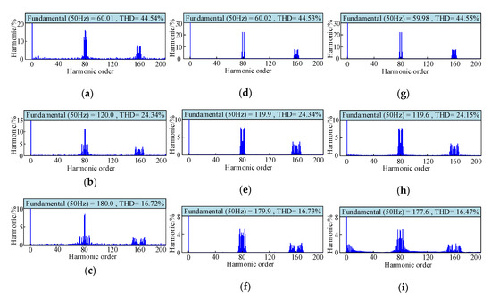 Output phase voltage uAN spectrum at different modulation depths. Traditional HF-PWM: (a) ma = 0.3; (b) ma = 0.6; (c) ma = 0.9. MHF-PWM: (d) ma = 0.3; (e) ma = 0.6; (f) ma=0.9. Power balance MHF-PWM: (g) ma = 0.3; (h) ma = 0.6; (i) ma = 0.9.
