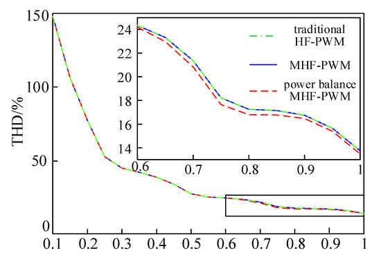 Figure 7 is a graph showing the relationship between the output phase voltage THD and the modulation depth ma of the three modulation strategies in the modulation depth of 0.1–1. It can be seen that the THD of traditional HF-PWM and MHF-PWM is the same in this modulation depth range. The THD of the power balance MHF-PWM modulation strategy is the same as the traditional HF-PWM and MHF-PWM modulation strategy with a modulation depth of 0.1–0.6, the THD of the output phase voltage of the power balance MHF-PWM modulation strategy is slightly better than the other two modulation strategies in the modulation depth of 0.6–1. This shows that the power balance MHF-PWM modulation strategy does not degrade the output power quality.