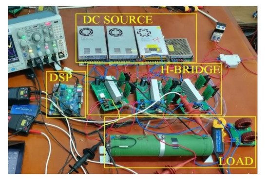 In order to verify the feasibility of the proposed modulation strategy, a power balanced MHF-PWM modulation strategy experimental platform was built. The experimental platform is controlled by DSP. The DC side voltage of the H-bridge is set to 50 V, 50 V, 100 V, the load resistance is 20 Ω, and the filter inductance is 4 mH. The carrier frequency is 5 kHz and the modulation wave frequency is 50 Hz. The experiments were carried out at a modulation depth of 0.6 and 0.9, experimental prototype is shown in Figure 8 and the experimental results are as follows.