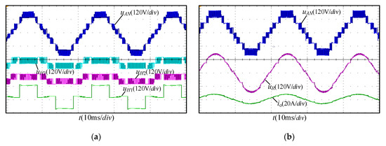 According to Equations (18) and (20), the power balance MHF-PWM modulation strategy enables high voltage units to participate in voltage output at full modulation, and by controlling the turn-on angle α, the output voltage fundamental amplitude of the high voltage unit is always half of the total output fundamental amplitude. The modulation strategy also keeps the amplitudes of the output voltages of the two low-voltage units equal. Finally, the ratio of the output voltage fundamental amplitude of the three units can be controlled to 2:1:1 at full modulation depth to achieve output power balance.