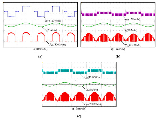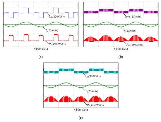 Figure 10 shows the output voltage, phase current and power waveform of each unit when the modulation depth is 0.9. The output power waveform is obtained by multiplying the output voltage of each unit by the phase current. It can be seen that the output waveforms of the two low-voltage units are basically the same, and the output power of the two is also very close. The average power output of the three units is 394.3 W, 192.2 W, and 191.8 W, respectively. Based on the output power of the H3 unit, the ratio of the output power of each unit is 2.05:1:1, which is very close to 2:1:1. This indicates that the power balance strategy proposed in this paper has a good control effect on the output power of each unit.