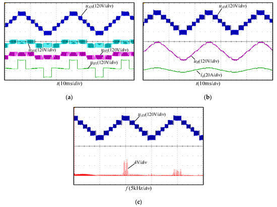 Figure 11 shows the output voltage current waveform and phase voltage spectrum of the power balance modulation strategy when the modulation depth is 0.6. It can be seen from Figure 11a that the output waveforms of the two low-voltage units are also PWM waves, and the high-voltage unit output step waves, compared with the modulation depth of 0.9, the output step wave width is significantly reduced. The phase voltage waveform obtained by superimposing the output voltage of each unit is a seven-level PWM wave. It can be seen from Figure 11b that the phase voltage after inductive filtering is also very close to a sine wave. As can be seen from the output phase voltage spectrum diagram in Figure 11c, its harmonics are also distributed at 10 kHz and its vicinity, and there are also a few harmonics at low frequencies, which is consistent with the simulation results.
