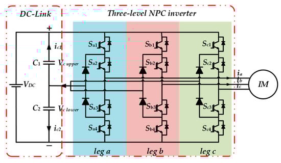 Circuit topology of three-level neutral-point clamped (NPC) inverter.