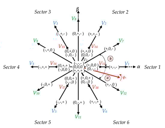 There are 19 distinct voltage vectors: Large (V1−V6), medium (V7−V12), small (V13−V18), and zero (V0). These voltage vectors generate 27 switching states, which represent the connection of stator to the DC power supply “−1,” “0,” and “1,” which denotes a connection to the negative DC rail, neutral point, and positive DC rail, respectively. Simplicity, the space vector diagram will be divided into 6 sectors and each sector will have two subsectors “a” and “b”. This arrangement will reduce the complexity of the three-level NPC inverter for DTC of IM drives.