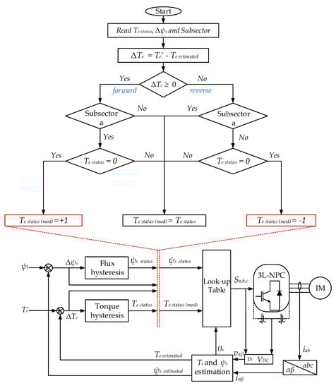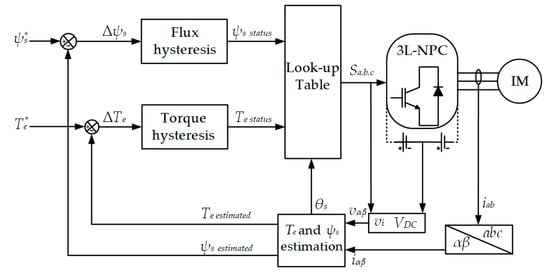 Figure 3 shows the complete structure of classical DTC for controlling the IM fed by a three-level NPC inverter. The main idea of this topology is applying hysteresis torque and flux regulators for controlling both stator flux ψs and electromagnetic torque Te. The designs of these hysteresis regulators are shown in Figure 4. With the output of the hysteresis regulators, the inverter switching states can be selected from a predefined switching table (see Table 1).