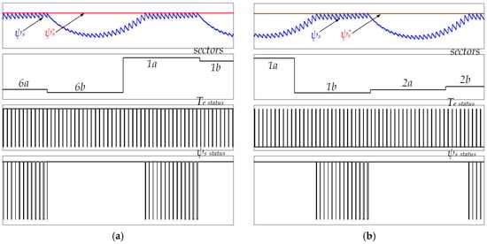 Recently, to meet the requirements of most advanced industrial applications such as cranes, tractions, and winches, researchers have focused on improving the low-speed operation of IM in both forward and reverse directions, where the stator flux is unregulated due to the domination of stator resistance and extensive utilization of zero voltage vector. In references [,], the authors have replaced the classical HTR by an overlapping-carriers regulator. Lower torque and flux ripples and constant switching frequency were achieved. Moreover, the stator flux of IM is regulated at the low-speed region. However, the dynamic response is slow because of the proportional-integral (PI) controller as compared to the classical DTC and it has some limitations when implementing on the DSP control board.