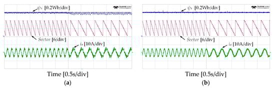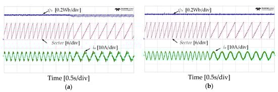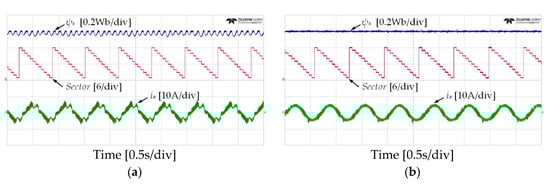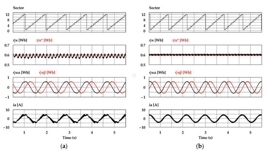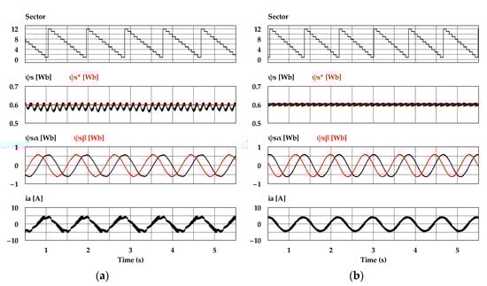 Figure 5a demonstrates the poor performance of DTC when IM is rotating in the forward direction. It is evident that the |ψs| droops at every “a” subsector. For example, at subsector “2a”, the small voltage vector v15 is applied to increase the Te, while the zero vector v0 is applied to reduce it. The |ψs| droops at the beginning of this subsector because the correspondent applied vector is too weak to regulate the ψs. Similarly, this problem is happening at every “b” subsector when the IM rotates in the reverse direction (see Figure 5b). For instance, at subsector “6b”, the small voltage vector v17 fails to regulate the ψs. This drop of the ψs affects the performance of the IM drives and results in high THD of the is.