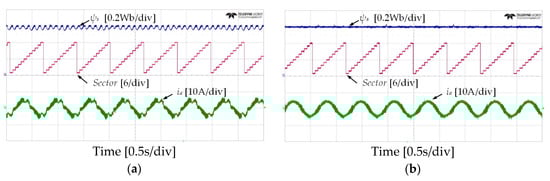 Stator flux, sectors and current responses of five-level HTR at 50 r/min in forward direction of IM: (a) classical DTC; (b) proposed DTC-SFRS.