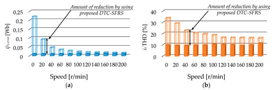 Finally, the analytical data of the stator flux error and stator current THD is presented in Figure 18. It is shown that the proposed DTC-SFRS successfully manages to maintain the stator flux error within the bands even at zero speed where the stator flux magnitude droops by 0.21 Wb. Moreover, the proposed DTC-SFRS reduced the THD of stator current to less than 10% over various speed regions including zero speed to have a robust control of the IM for advanced industrial applications.