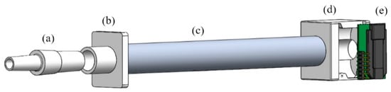3D model of sampling tube components: (a) One-way mouthpiece; (b) Front-end tube connector; (c) Sampling tube; (d) Back-end tube connector; (e) Sensor module.