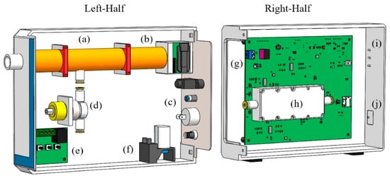 Internal layout of WOLF Breath E-nose components: (a) Sampling tube; (b) Sensor module; (c) Back plate with USB, exhaust, on/off button and DC power jack; (d) 3-way valve; (e) Heater relay module; (f) Pump; (g) Custom PCB; (h) Sensor chamber; (i) Indicator LEDs; (j) Sampling button.