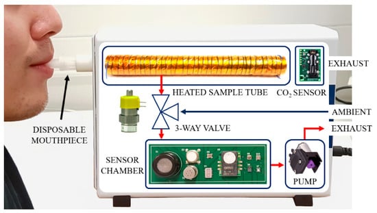 An internal system view of the WOLF Breath E-nose is shown in Figure 3. The red and blue arrows indicate the different flow-paths through the device. The dimensions of the unit are 7 × 16 × 23 cm and weighs less than 1 kg. An external view of the unit is shown in Figure 4.