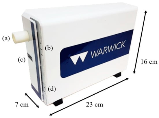 WOLF Breath E-nose: (a) Mouthpiece holder; (b) LED status indicators; (c) Sampling tube temperature indicator; (d) Sampling button.