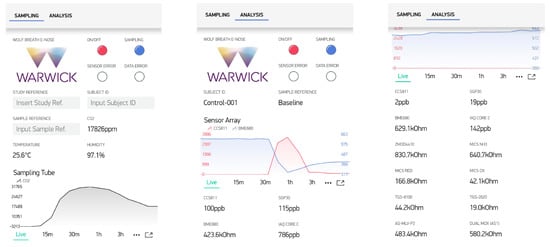 The unit can be controlled from a laptop, via wired USB, or using Wi-Fi through a simple mobile app that was developed using Blynk. This app provides a free IoT platform for Android or iOS and is compatible with commonly used IoT hardware, such as Arduino, Raspberry Pi, ESP8266 and ESP32. The ESP32 (Espressif Systems, Shanghai, China) was used as the microcontroller for our system, because it is a low-cost, low-power chip with integrated Wi-Fi and Bluetooth communication capabilities. The custom ‘WOLF Breath E-Nose’ app includes 2 tabs: sampling and analysis, as shown in Figure 5. The sampling tab includes 3 input fields to include details such as study name, subject ID and sample name. In addition to this, status indicators from the front-panel of the device are shown, as well as real-time readings of CO2, temperature and humidity from the SCD30 sensor. The parameters can be selected and plotted on the graph, as shown with CO2 in Figure 5 (left). The analysis tab shows the real-time readings from the gas sensor array. Individual or multiple outputs can be selected and plotted on the graph, as shown with CCS811 and BME680 in Figure 5 (middle). The other readings can be seen by scrolling down, as shown in Figure 5 (right). The sampling rate of the sensor data was set to 1 sample per second.