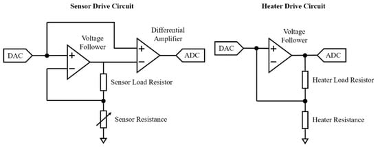 Simplified circuit diagram of sensor and heater drive circuits for analogue MOX sensors.